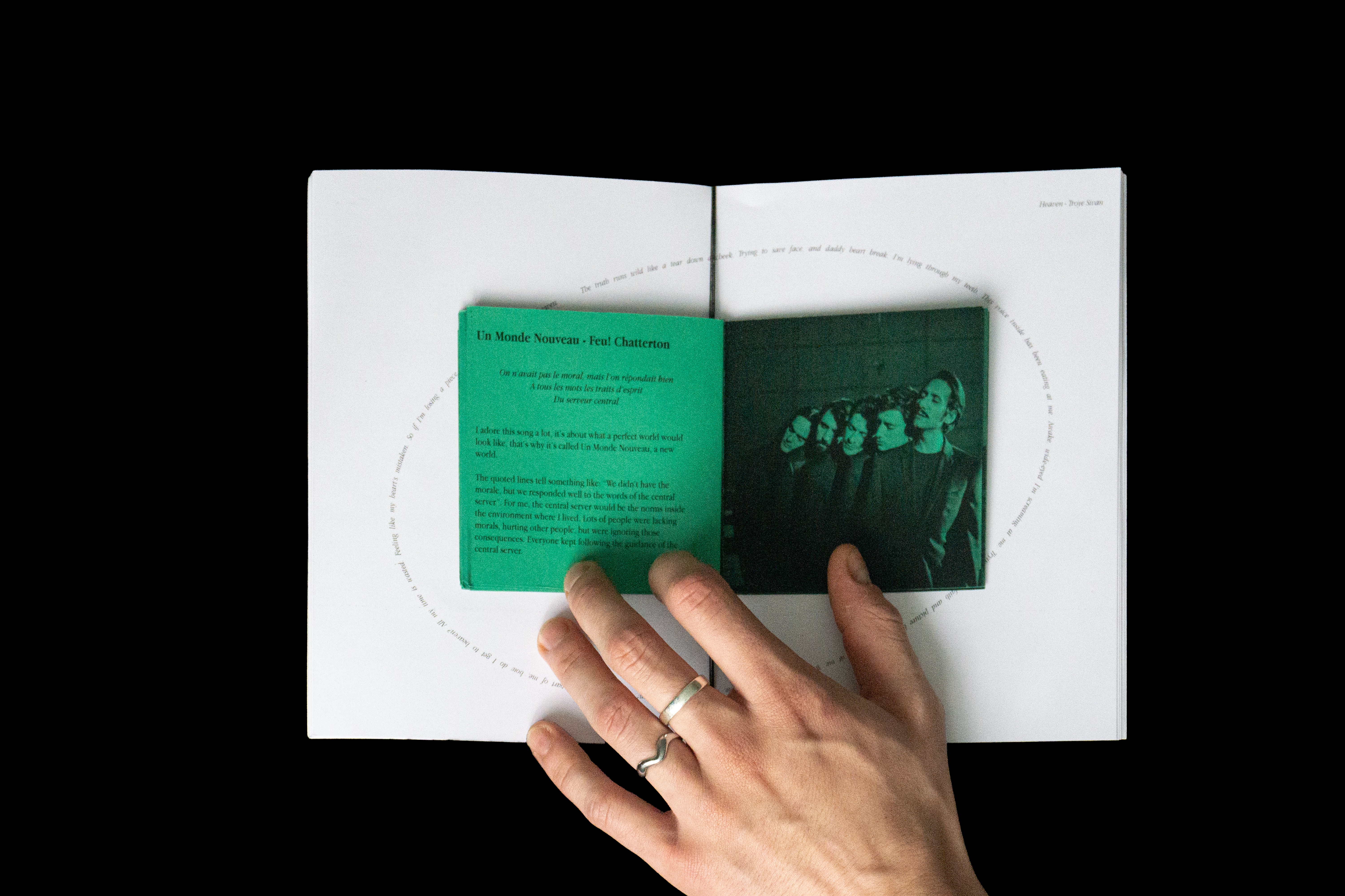 The publication combines imagery and song lyrics that evoke emotion, comfort, and reflection. The songs act as emotional anchors, connecting different phases of feeling and growth. I wanted the design to reflect a sense of vulnerability and softness, which I expressed through the use of small serif type, an intimate A5 format, and translucent pages of tracing paper that layer and blur the content — much like memories themselves.